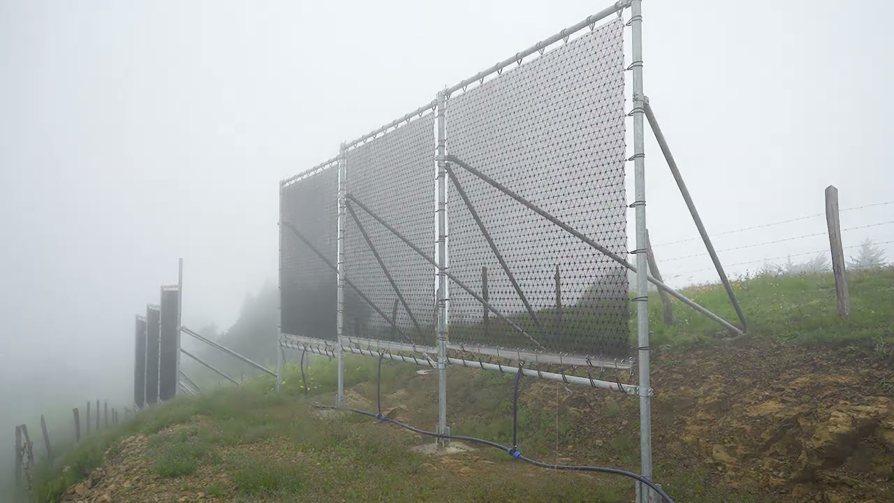 Los colectores de niebla suelen consistir en una malla suspendida entre dos postes. La malla sirve como superficie de intercepción para atrapar la humedad. Las gotas se acumulan en la malla y caen en un canalón que conduce a los tanques de almacenamiento de agua. Es un sistema pasivo que no requiere energía externa.