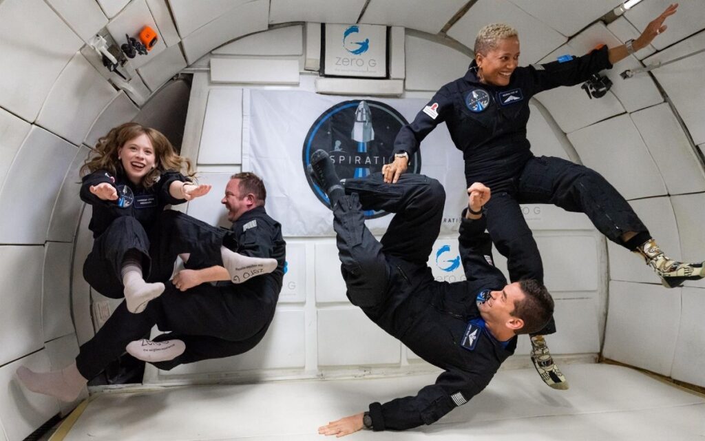Los cuatro tripulantes de la primera misión espacial compuesta solo por civiles se aboca en su primer día en el espacio a investigar el efecto de los vuelos orbitales en el cuerpo humano.